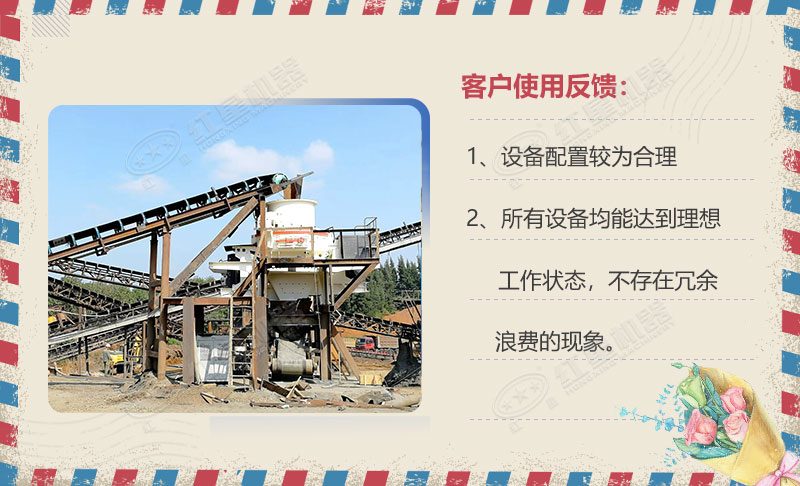 整條制沙生產(chǎn)線設(shè)備配置較為合理,所有設(shè)備均能達(dá)到理想工作狀態(tài),不存在冗余浪費(fèi)的現(xiàn)象,且產(chǎn)出的沙石成品也都不錯(cuò)(可以賣上好價(jià)錢),僅投產(chǎn)半年已處于盈利狀態(tài),客戶表示很滿意!